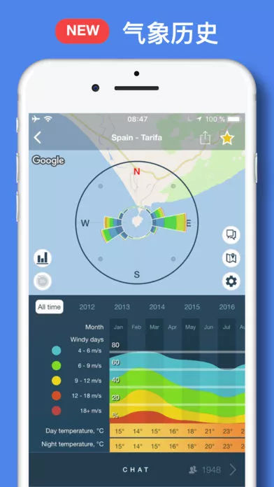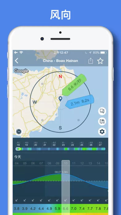 风速风力的显示都非常明了,尤其是当你滑动下方的时刻表,上方的风向风速指示也会以动态的方式呈现,非常具有科技感。