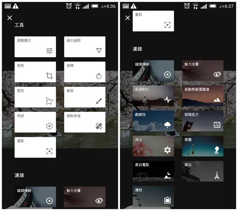 Snapseed的界面简单,功能分两类:工具和滤镜。