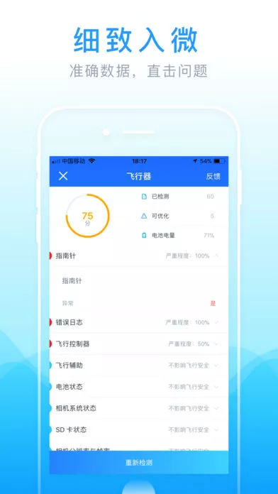 安飞可以有效评估飞行器、遥控器和飞行环境的重要组成模块,比如: GPS、指南针、云台、电池、限飞区、免撞保护、SD 卡、天气等等,并且安飞适配大疆系列所有无人机机型。
