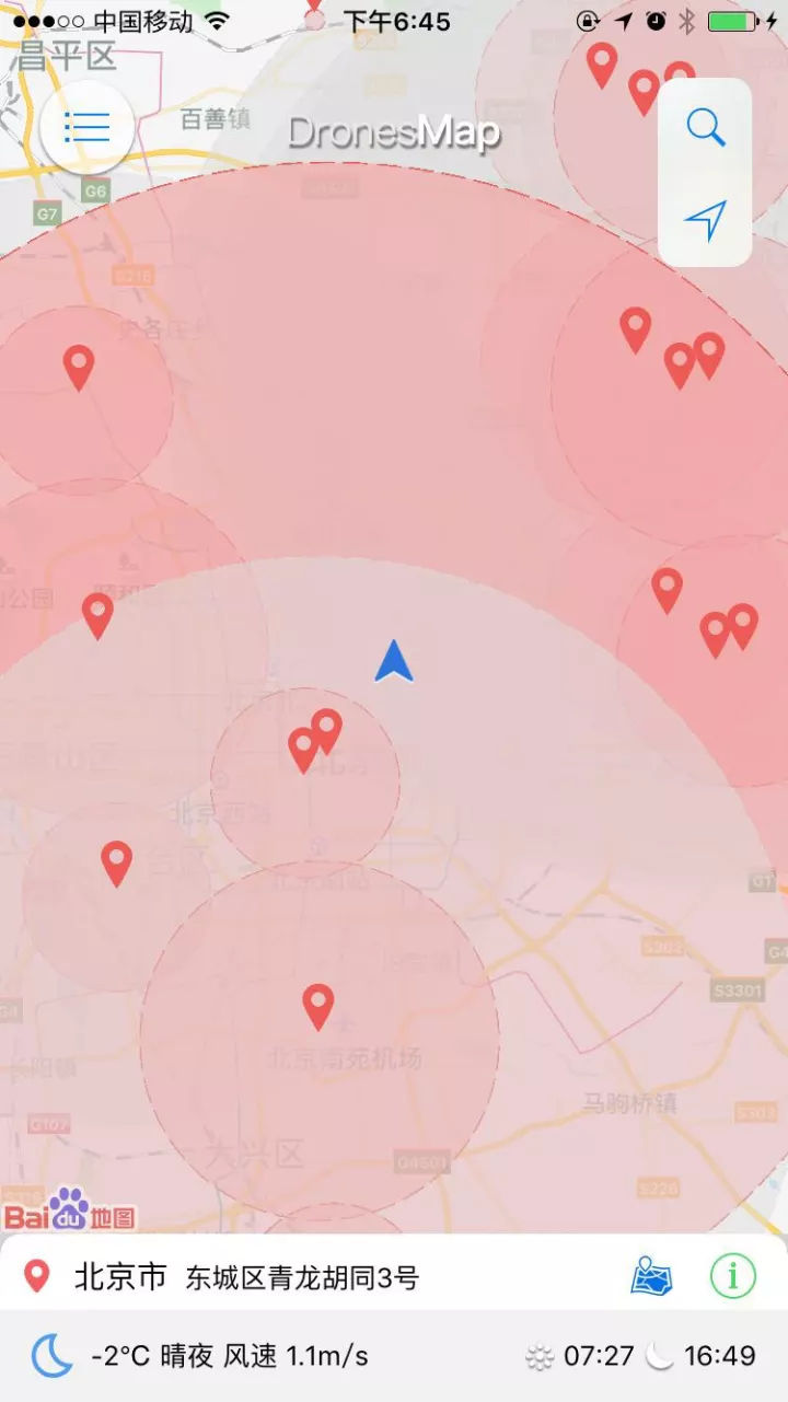 DronesMap在笔者亲测的几款软件中禁飞区是最完善的。就北京来说,五环以内是禁飞的,而其他软件要么只是显示机场糖果形禁飞区域,要么就只限制的二环,而DronesMap却非常正确的显示出禁飞区域。