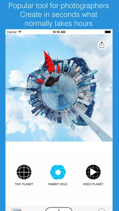 能让普通照片变成360度的旋转效果,就像一个小小的星球一样,根据拍摄内容的不同,还能制作出类似爆炸的特殊效果。用户要做的只是从相册中挑选出一张适合的照片,应用提供两种旋转方式,一种是向内一种是向外,制作完成的作品绝对能让人眼前一亮。