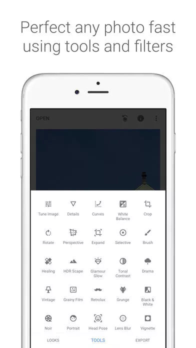 工具是对照片参数(色彩、透视等)进行调节。Snapseed工具很多,大体把他们归为三类: