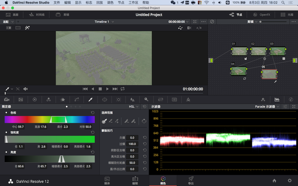 接着进行局部调色,同样是碍于电脑性能,这种4K真的有些吃力,卡顿严重。所以只能对草坪这些大面积的颜色进行每个镜头的颜色匹配。我已经尽力了,尽量让不同镜头、光线下草坪颜色看起来是一个色相。因为草坪抠像限制器渲染不流畅的问题,渲染了3次反复的工作去调整草坪的颜色。