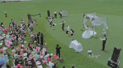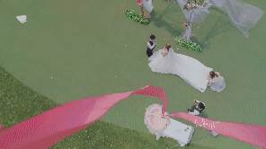 根据流程时间,抓拍接亲车队抵达、嘉宾入场、新娘新郎仪式中的重要环节。镜头普遍采用手动刷锅来保证画面不那么死板,并且机动性强,也不要乱飞找感觉,从而造成意外的安全问题。这种情况下画面美不美已经不重要了,重要的是安全,以及“拍到了”。