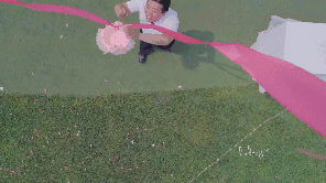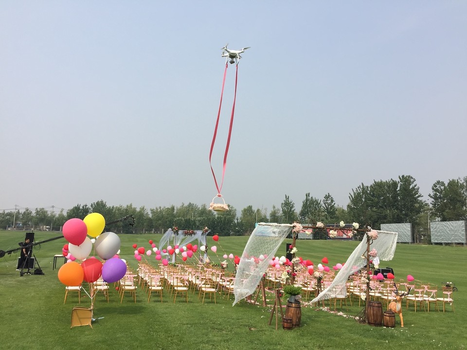 所以给新郎看了一些事故录像,并研究了如下的方案:绳子极长,起飞时候避免刮风和螺旋桨的气流造成彩带卷入螺旋桨,所以一定要拉直彩带再启动螺旋桨。
