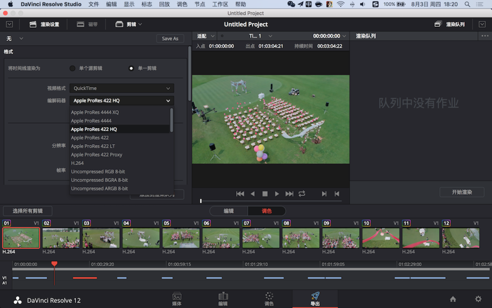 结尾就是渲染导出了,一般情况下,建议使用ProRes 422 HQ, 就够我们民用级使用了。如果非要出ProRes 4444 这个级别,实际测试用电脑观看,除了容量大了,画质上即使对比,也是很难看出来。分辨率选择1080,25帧即可,因为我们已经剪辑完毕了,这就已经是成品了。