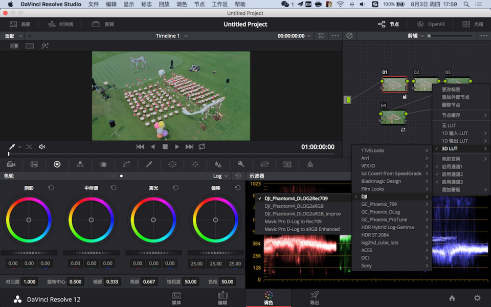 将FCPX的结果输出XML和达芬奇进行套底操作。在达芬奇里,我习惯先套LUTs,试了很多LUTs后,效果都不理想,有的太胶片,太浓重,以至于草坪是黄色的。大夏天的草坪婚礼,咱们弄得黄黄的,看着是挺有感觉的,但我猜新郎一定不喜欢,最后回归理智选用了原生的DJI 709 版本。不过这里说一下,目前还没有Phantom 4 Pro 的LUTs,希望大疆赶紧出!
