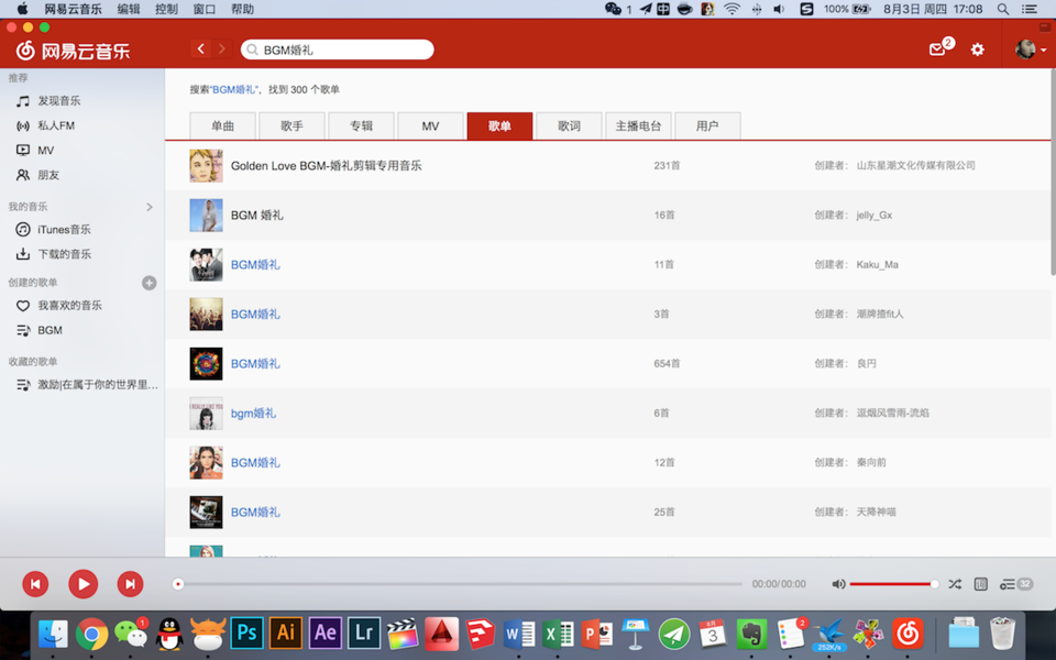 惯用的婚礼背景音乐并不很适合纯航拍镜头的婚礼成片,而且也难免落入俗套。所以在背景音乐的选择上也是听了很多很多,这个效率的低下也是赖于平日对音乐素材的积累匮乏。在这里给大家推荐使用网易云音乐,直接搜索关键词,进入歌单选项,然后就一个一个听吧,没有积累的情况下,就是碰运气。选定了背景音乐后,再加上确定的构思,再想想自己的“技能树”。大概成片是一个什么样子,心里已经八九不离十了。