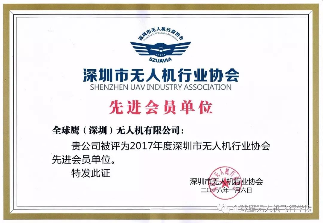 全球鹰无人机荣获2017年度无人机行业先进会员单位