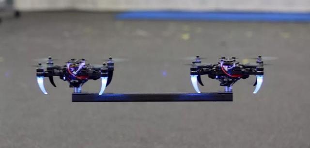 Vijay Kumar在UPenn的实验室一直致力于使用他们不依赖于GPS的四旋翼飞行器来运输有效载荷,他们正在协同工作 -这个想法是,一个四旋翼飞行器移动的物体可能会被多个四旋翼飞机移动,一起工作,最终,他们可能成为在仓库周围移动物品的最佳方式。