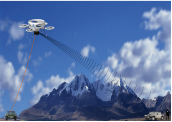通讯通视距离公式:D=4.12*(sqrt(H1)+sqrt(H2)),其中D是通视距离(km),H1是飞机高度(m)即基站的高度,H2是通讯终端高度。可见,要想通讯距离远,就得把我基站升得更高。目前大多数应用是把基站放在车载的桅杆顶上。系留300米,信号辐射可达80KM。相对于100米高度的系留无人机系统,新型的300米系留无人机挂载通讯基站可将通讯覆盖范围从半径50公里提升到80公里。