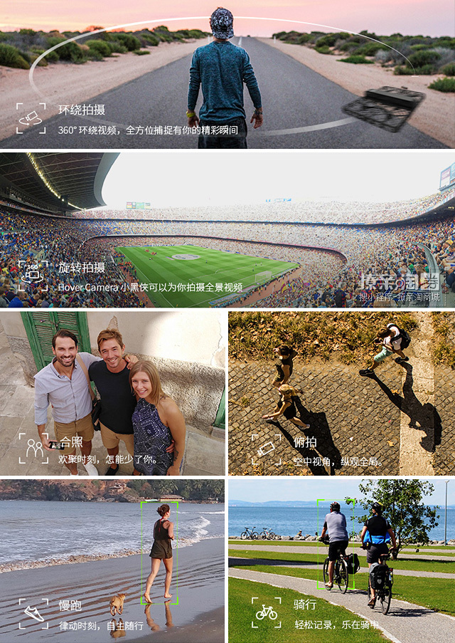 「多场景应用」环绕+旋转+合照+俯拍+慢跑+骑行