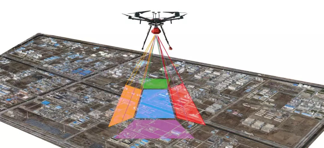 五镜头作业法。五镜头相机在一个点位上统一曝光,一次曝光,获取前后下左右五个视角的照片,因此可以在稳定匀速行驶的无人机平台上稳定的获取曝光的数据。