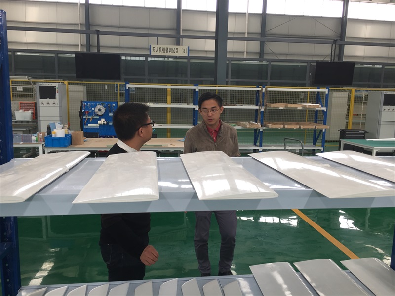 在简单介绍完机型的特点之后,周总便带着我们参观了工厂,一开始我们进入的就是该公司的零部件区域。在这里,我们看到电池和飞控、云台等零部件整齐的摆放,周总说这里就是让工程师们进行零部件与无人机的搭载测试的地方。每一个零部件都不能马虎,要准却的测试出他们的特性和使用情况。转眼间我们又来到了他们制造符合材料的外面,看到一些原材料进行着特殊的工艺,进而制作出新的复合材料,这种材料的重量比其他市面上其他同机型上面使用的材料更轻更坚固,再一次感叹他们的工艺。之后我们又来到了他们进行机身定型的车间,在做好的新材料上面直接开出两片机翼。最后,周总还跟说道一些周视经纬用在机翼上的小设计,从而大大减少了飞机在空中降落时候的阻力,而往往受欢迎的产品总是因为一些不起眼的小设计而成为经典的。