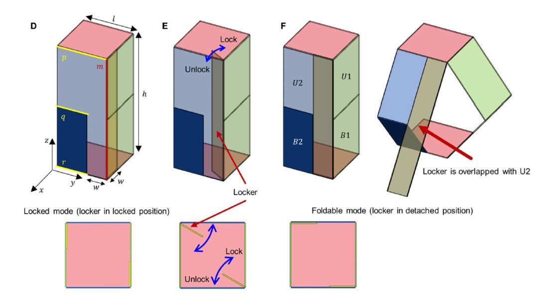 这款折纸机构是由上图所示的长方体组成,四个侧面中分为可折叠部分和垂直部分。长方体内部设有一个加强肋是简单的锁死装置,当长方体展开时它通过磁体固定在制动器的一个壁上并赋予它轻度。当被拉伸时,它也会像结构的其他部分一样折叠。
