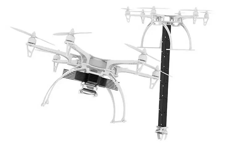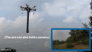首尔大学的研究人员们将这些能变形的盒子串联在一起,并在无人机顶部安装可控制的电动机来拉动他的线来控制机械臂的收缩与伸长。
