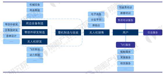 转载 2018-04-10 07:53 来源:前瞻产业研究院无人机属于高科技产品,拥有者较为复杂的产业链。按照上 下游可以分为产品研发制造试验、飞控系统、动力系统、周边设备的研发制造、整机组装、 产品销售及产品服务等环节。