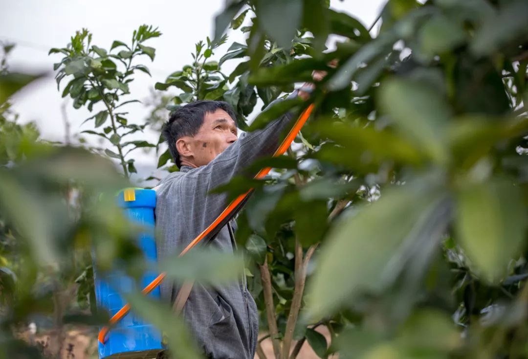陈贺的父亲在给蜜柚树喷药