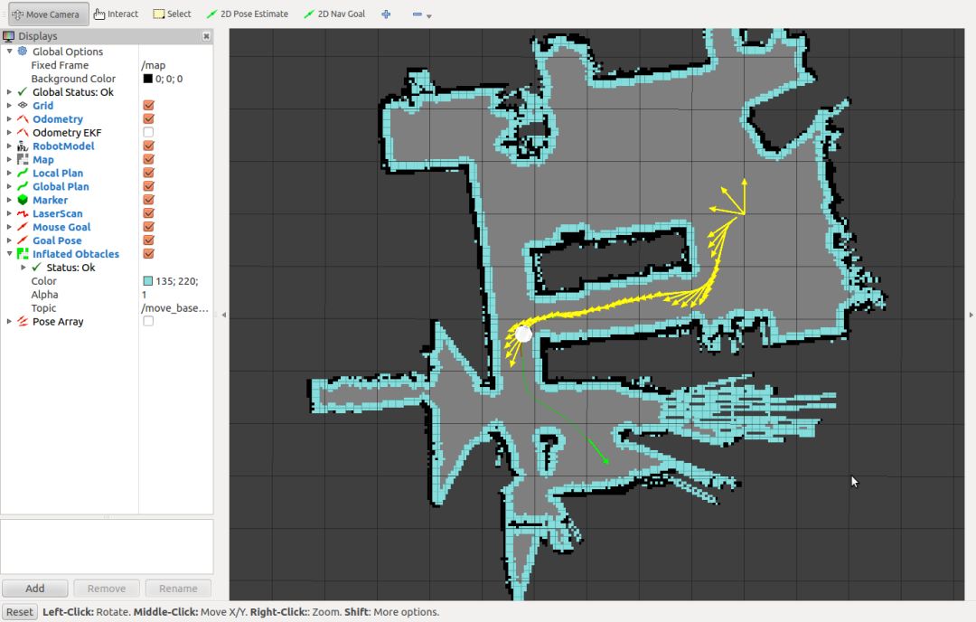 使用rviz工具栏上的2DNav Goal,为机器人设置目标位姿(绿色箭头),运行效果如图3所示。
