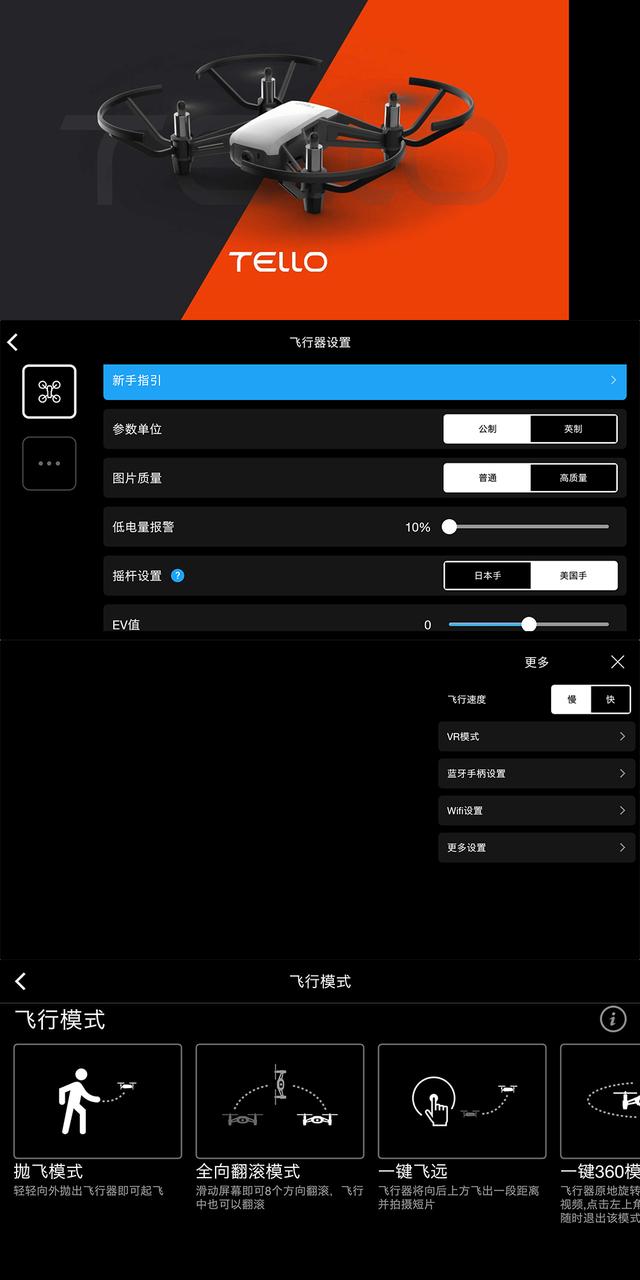 Tello特洛无人机没什么学习成本,操控界面非常的直观,左侧虚拟遥控控制转向和垂直方向的起降,右侧虚拟摇杆控制水平方向的位移。左上角一键起飞,右上角为拍摄控制,基本上手就可以愉快的玩耍了,在客户端界面带有新手指引功能,完全没有接触过无人机飞行器的人群跟着看一遍也就可以上手了。
