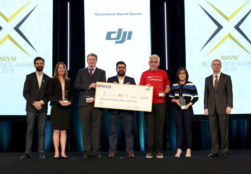 AUVSI XCELLENCE人道主义奖由大彊创新( DJI )赞助,得奖者可获 5000 美元现金奖励。 5 个得奖组织分别在救灾、医疗协助及搜救领域作出高度贡献,有关组织如下:
