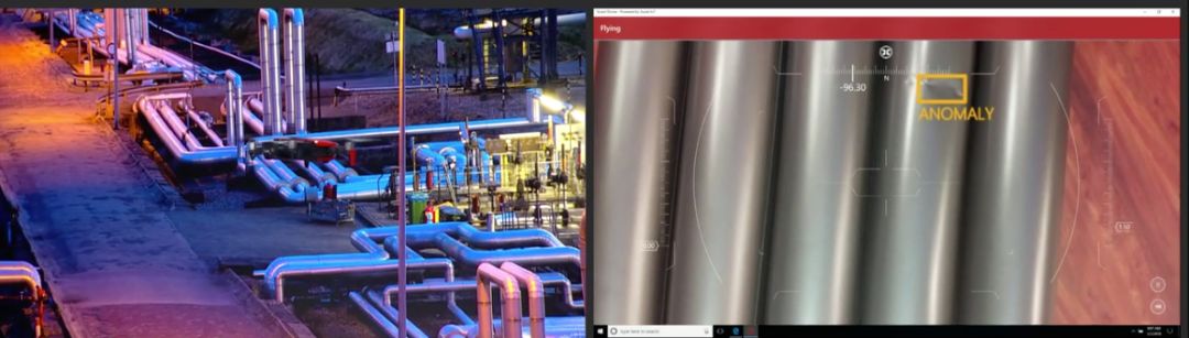 作为此次战略合作成果之一,大疆在Build大会现场进行了无人机AI应用演示。在一个模拟化工厂管线故障的场景中,当传感器报障后,巡检人员使用无人机对工厂顶部管线进行扫描,画面回传至PC进行同步分析,自动识别管道裂缝并在图像中标记。