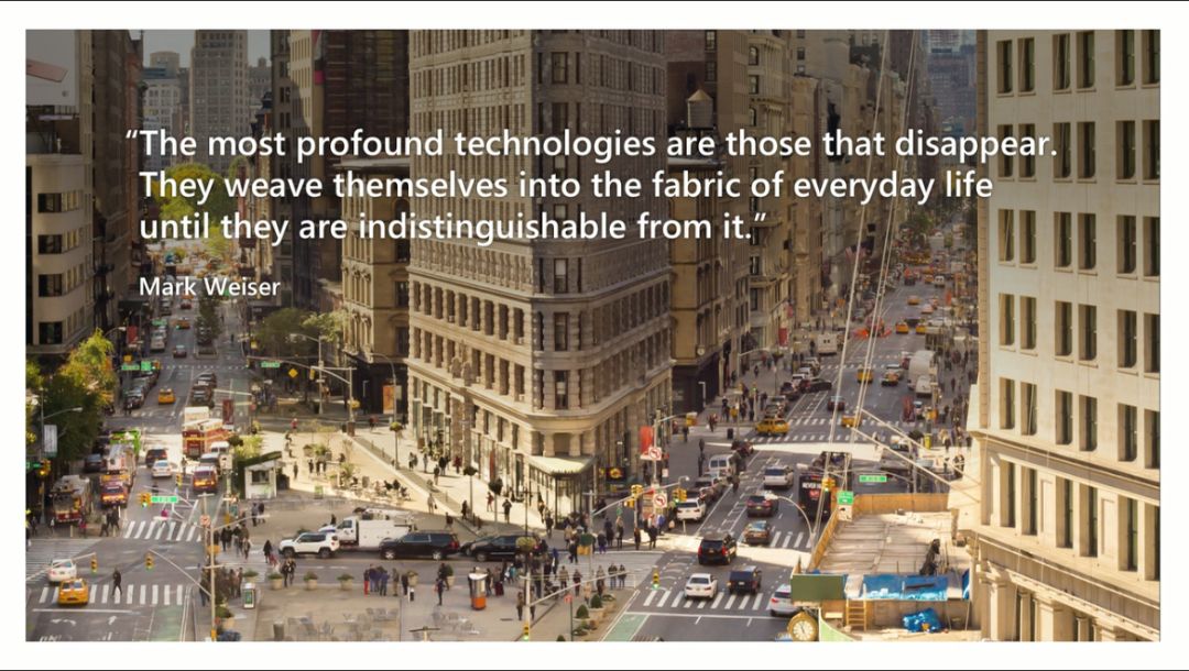 纳德拉在大会主题演讲上引用了普适计算之父马克·维瑟的一句话“影响最深远的技术是那些无形的技术。它们融入生活,成为生活本身。”