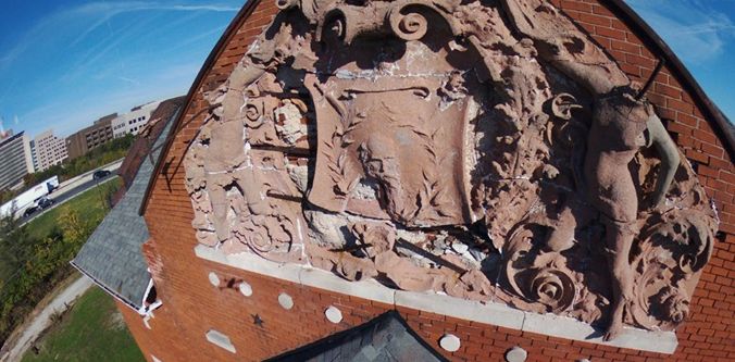 RATIO建筑事务所承接了一项古迹修复项目,需要恢复The South Side Turnverein大楼西立面的精美雕刻群。修复本身对于RATIO来说并不复杂,但另人烦恼的是雕刻位于大楼屋顶。RATIO的工作人员,如果要对标的物进行勘测以核算前期费用,就不得不使用脚手架或梯子爬上屋顶,进行实地测量。而这在安全性,成本费用,工作效率上都将大打折扣,这并不是他们所期望的。 然而Parrot一体化3D建模解决方案完美的帮助RATIO解决了所有难题,并根据探测结果创建了一套最新的雕刻3D模型,使他们能够精确的核算项目成本及工期时间,并及时开展修复工作,避免工期延误。