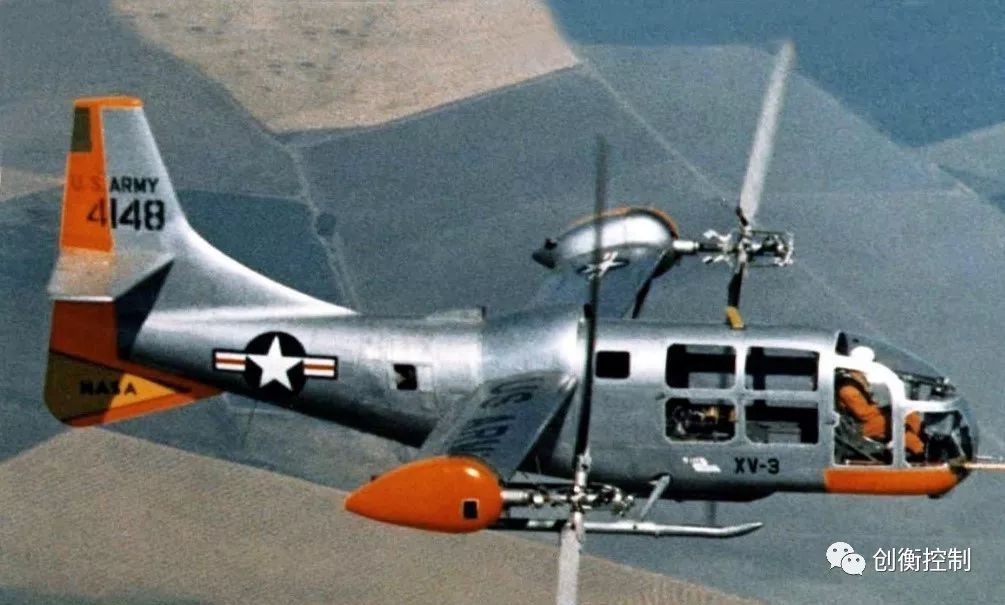 美国早在上个世纪四十年代开始对倾转旋翼技术进行研究,但其发展过程中十分曲折。1955年,美国贝尔公司成功研制倾转旋翼原型样机XV-3,采用两台活塞发动机安装在机翼两侧,通过变速箱与传动轴分别驱动两副旋翼系统,1958年12月成功完成两副旋翼系统倾转飞行实验,验证了倾转旋翼概念的可行性,如图所示。