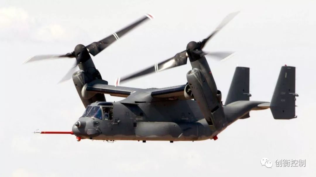美国先后继续研制出XV-15,V-22等系列倾转旋翼机,其中V22在机翼两端各有一可变向的旋翼推进转置,各包含涡轮轴发动机及三桨叶组成的旋翼,整个推进装置可以在向上到向前之间转动变向,产生向上或向前的推力,分别用于直升机垂直起降或悬停以及固定翼飞行阶段。V-22“鱼鹰”倾转旋翼机是世界上第一种投入使用的倾转旋翼机,如图所示。