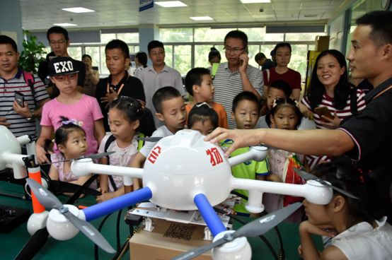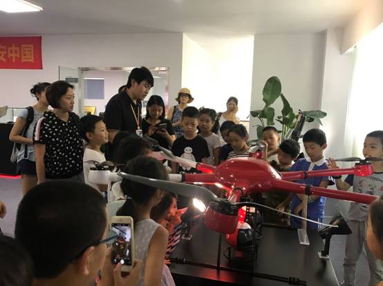 在行政中心二楼展厅,研发团队在为各位小学生现场介绍洲际通航各款无人机得应用、续航、载重等等,并回答他们提出的各式各样问题。