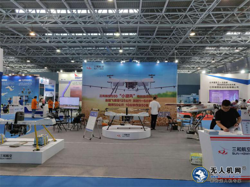 三和航空携S50“小旋风”和”复合翼无人机亮相展会。S50“小旋风”无人机的动力系统选用了42马力的航空发动机,无人机载药量50公斤,一个架次10分钟可有效作业50亩以上,日作业量超过1500亩。