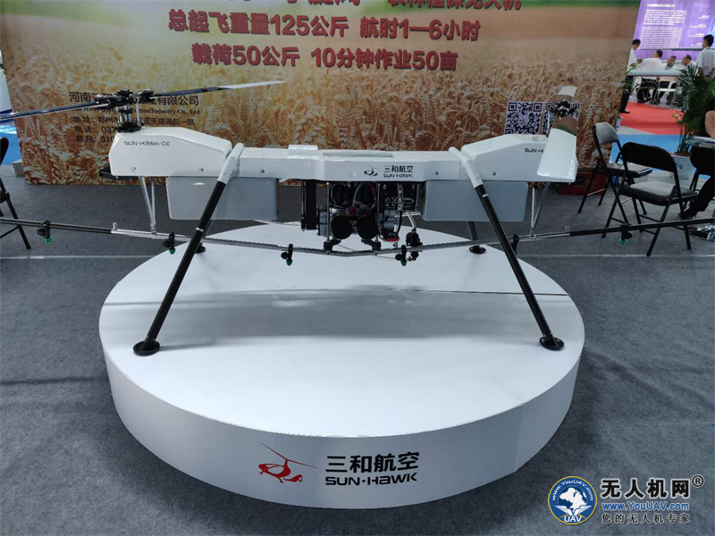 S50是三和航空自主研发的一款专门针对于农林植保行业量身打造的产品。该款飞机采用单台航空汽油发动机保证充足的动力,同时采用了横列双旋翼布局,翼展达到4.75米,药杆长度5.2米,有效风场宽度可达到12米,因此能够为飞防作业提供大而柔和的有利风场。