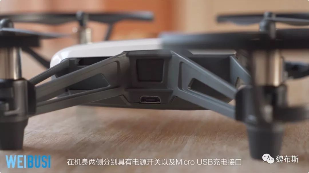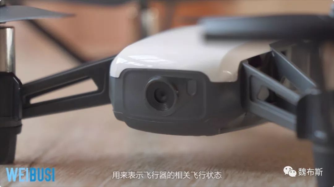 在机身前部为一颗500万像素的相机,在相机旁边则为一颗LED指示灯,用来表示飞行器的相关飞行状态。在机身的两侧分别具有电源开关,以及Micro USB充电接口,在机身后部则为电池仓。
