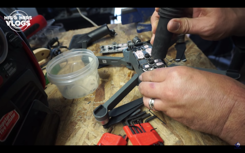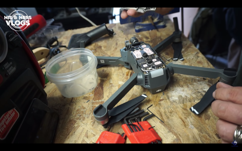 首先,Ben 为 Mavic Pro 施行「心肺复苏术(CPR)」,也就是利用机器从外部真空吸湿,包括 4 个桨翼的摩打/马达、电池卡槽、记忆卡插槽、通风口、云台,以及电池等;再打开机身底部的盖板,加强真空吸湿。然后让「病患」Mavic Pro 休息,即是配合风扇带走水份、湿气,同时让它随时间自然风干。