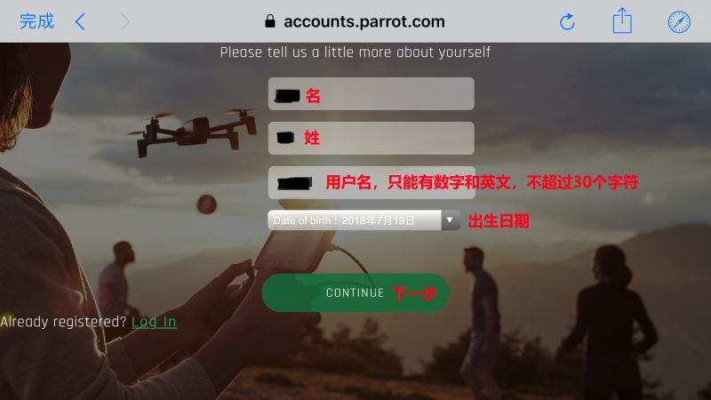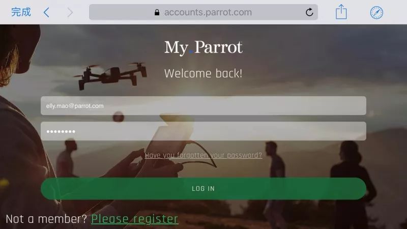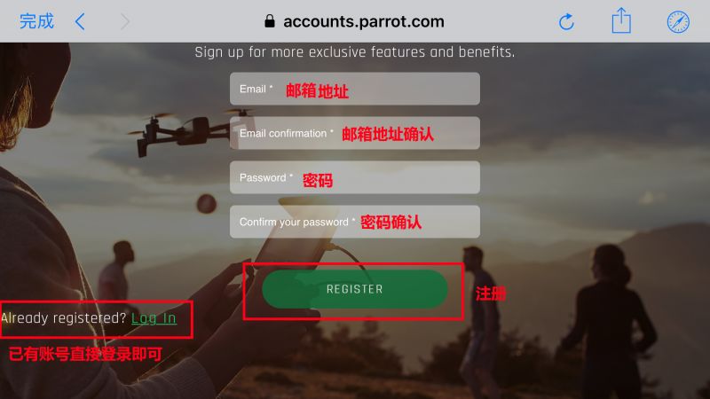 如您已有My Parrot账号,请在打开APP后点击主界面的“Register” 注册,则会弹出登录页面,再点击左侧“Log in”登录。