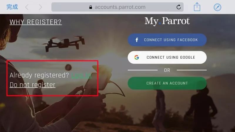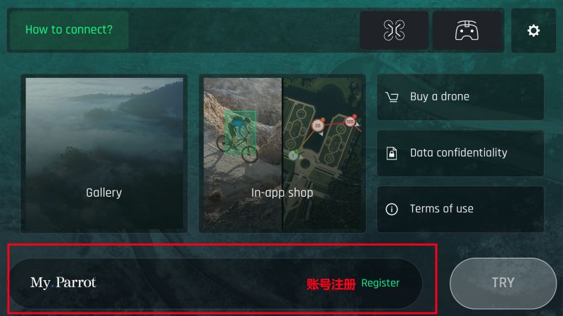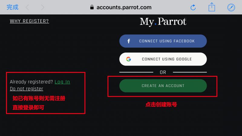 如您还没有My Parrot账号,请先断开与无人机之间的连接,使用4G或者WIFI 连接互联网注册。同样在打开APP后点击主界面的“REGISTER”注册后,点击右侧的绿色“CREATE AN ACCOUNT”创建一个新的账号。
