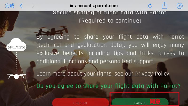 在弹出飞行信息与Parrot共享的确认页面中,点击绿色 “I AGREE”同意即可。