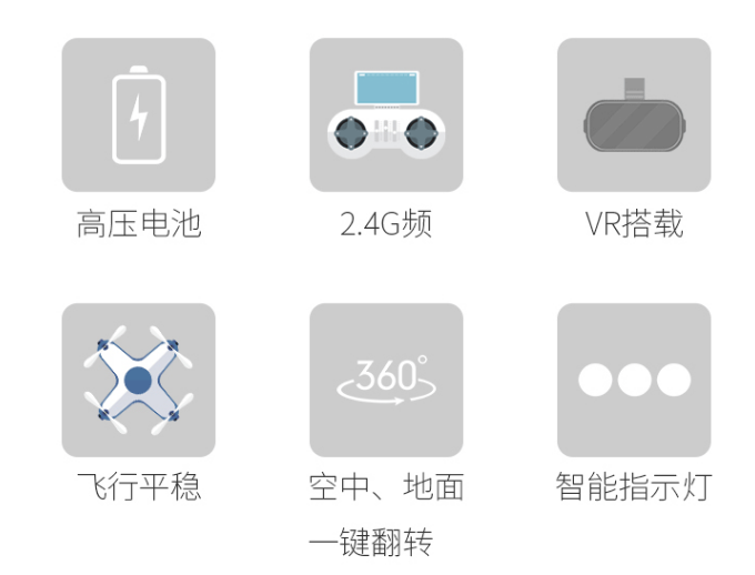 打开包装盒可以很清楚的看见所有物品,其中包括:一架小型的多旋翼无人机,一个双手可握的手柄,一块电池,一个充电器,以及3块5号电池。总之,用户拿到手之后,只需装上电池立马就可以上手体验飞行的乐趣了。