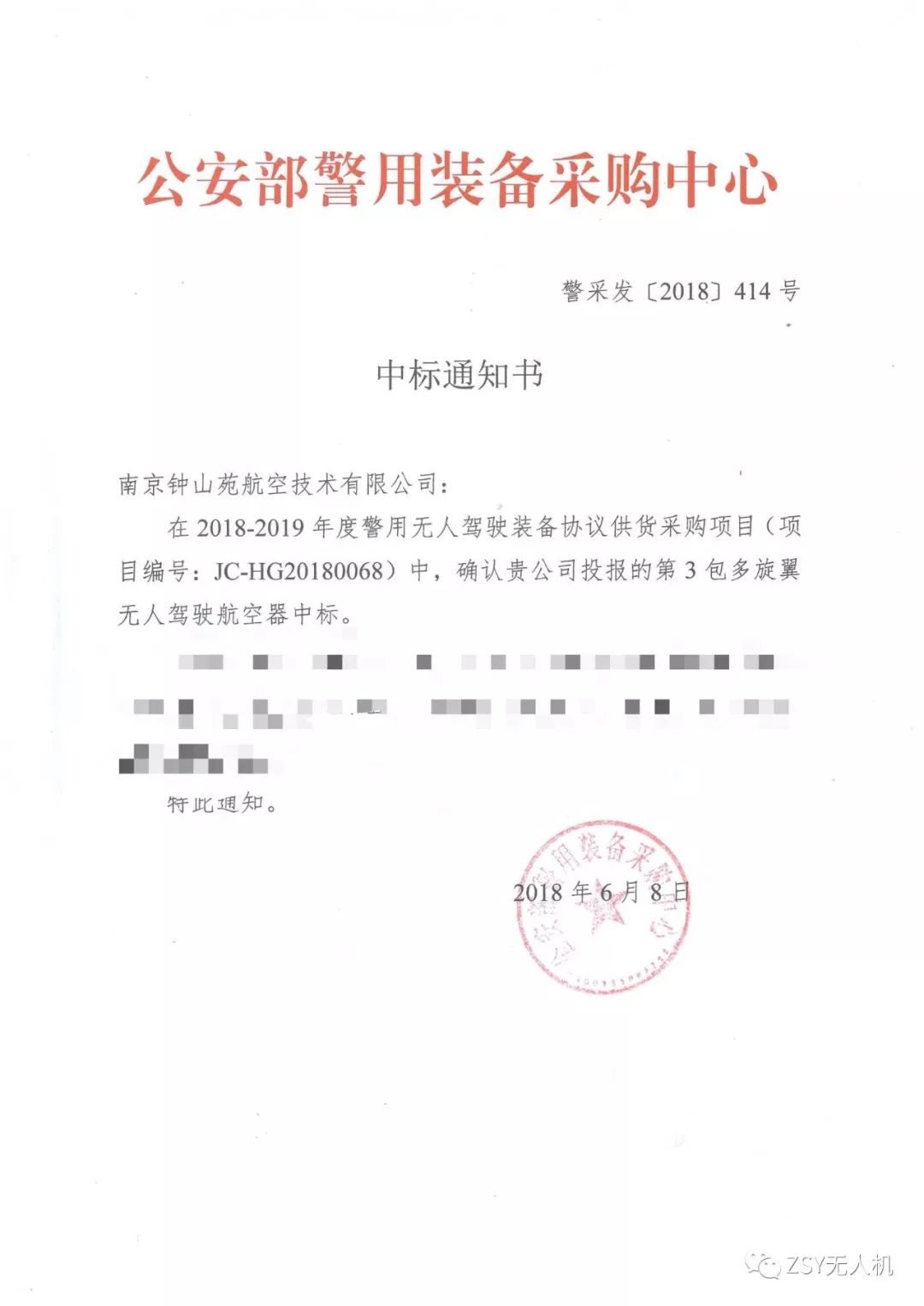 南京钟山苑收获公安部警用装备采购中心中标通知书