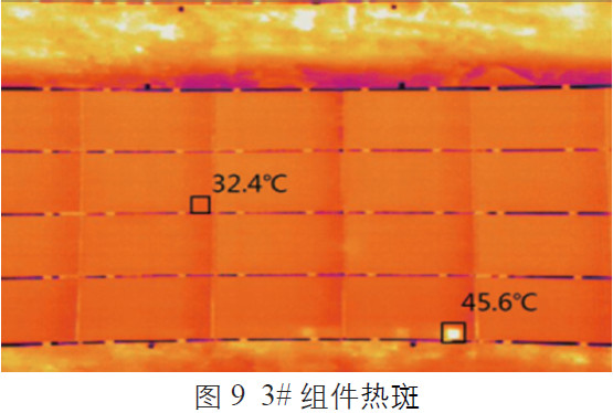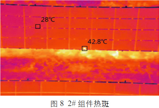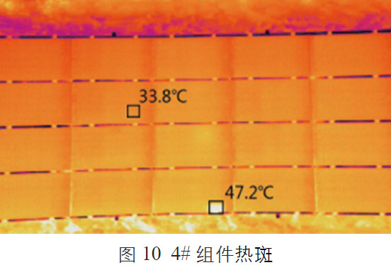 经过对检测结果对比分析,发现抽检的16排光伏组件中,共有4 块组件出现热斑,具体为:1)1# 组件位于第5 组串的第11 排、自西向东第11 列,组件温度为28℃,组件局部温度为42 ℃,比组件温度高出了14 ℃,判定该块组件有热斑,如图7 所示;2)2# 组件位于第7 组串的第11 排、自西向东第7 列,该组件温度为28 ℃,局部温度为42.8 ℃,比组件温度高出了14.8 ℃,判定该块组件有热斑,如图8 所示;3)3# 组件位于第3 组串的第12 排、自东向西第5 列,该组件温度为32.4 ℃,局部温度为45.6 ℃,比组件温度高出了13.2 ℃,判定该块组件有热斑,如图9所示;4)4# 组件位于第4 组串的第13 排、自西向东第6 列,该组件温度为33.8 ℃,局部温度为47.2 ℃,比组件温度高出了13.4 ℃,判定该块组件有热斑,如图10 所示。