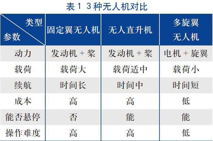 目前市面上无人机主要分为3 种:固定翼无人机、无人直升机及多旋翼无人机。3 种无人机的比较如表1 所示,固定翼无人机续航时间长,但是无法悬停;无人直升机各项性能适中,但是成本很高,操作难度也大;对比之后最终选择成本低、操作难度小、可悬停的多旋翼无人机。