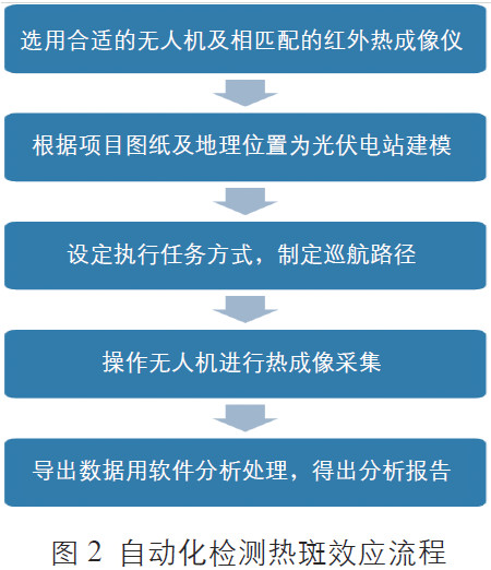 针对传统热斑效应检测方法的诸多不便,本文提出一种自动化检测热斑效应的方案。自动化检测热斑效应的系统主要由无人机、机载红外热像仪及相应的控制系统组成。具体的检测流程图如图2 所示。