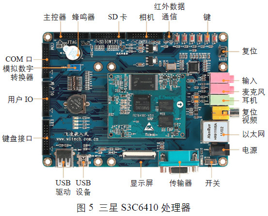 嵌入式控制端采用三星的S3C6410 处理器( 如图5 所示) 来实现对机载热像仪的控制及实时图传、数据处理功能。S3C6410 处理器长宽尺寸仅为5 cm×6 cm,可方便地与FLIR Vue 机芯对接。S3C6410 处理器拥有众多的数据接口,其中GPS 接口可接入GPS 模块,通过将GPS 信息叠加在红外热斑图像上,方便后期定位故障的光伏组件;通过无线网卡接口可实现图像实时传输,方便在检测的过程中悬停拍摄故障组件以得到详细数据;SD 卡座接口可插入SD 卡,以实现对检测数据的存储,方便后期处理。