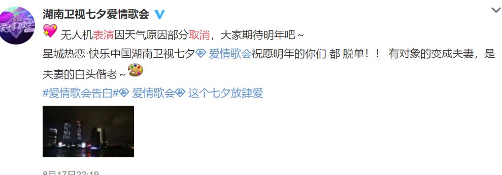 关于本次#长沙七夕当晚无人机灯光秀#环节取消的致歉: