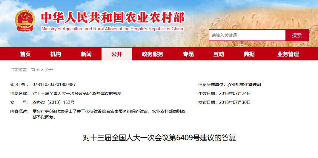 7月30日,针对十三届全国人大一次会议罗金仁等6名代表提出的关于扶持建设综合农事服务组织的建议,经农业农村部与财政部协商后,给出了回复。