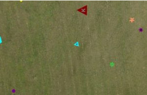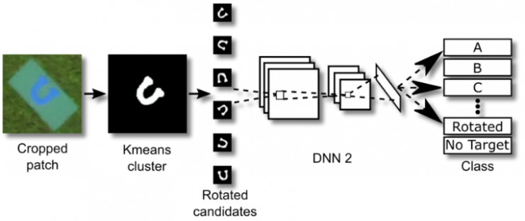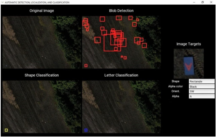 其中的一项任务是对地面目标进行自动检测,定位和分类(ADLC)。每个地面目标都包含了位置(经纬度)、形状(圆,三角等)、字母(每个地面目标都被一个居中单词表示,如图 1 所示)、字母方向和颜色这几个特征。这些地面目标在竞赛前都是未知的,并被分散在杂乱无章的任务区域中。无人机需要在任务区域的上空飞行并识别这些目标以及它们的属性和位置。