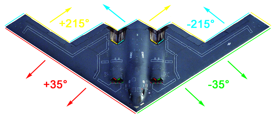 还是以B-2A轰炸机为例,其平面轮廓由12条互相平行的直线组成,整个外翼段都为等弦长机翼,机翼前缘与机翼后缘和另一侧的翼尖平行。翼尖进行了切尖处理以平行于另侧机翼前缘。机身尾部后缘为W形锯齿状,边缘也与两侧机翼前缘平行。