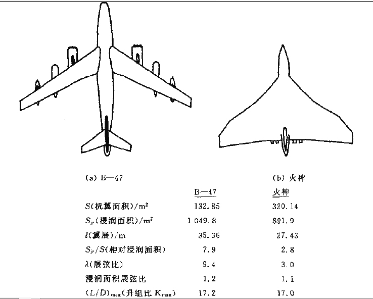 尽管火神轰炸机的展弦比只有3.0,而B-47的展弦比高达9.4,但是由于火神可以认为采用了变形的飞翼布局,其浸润展弦比较低,两者升阻比相当。