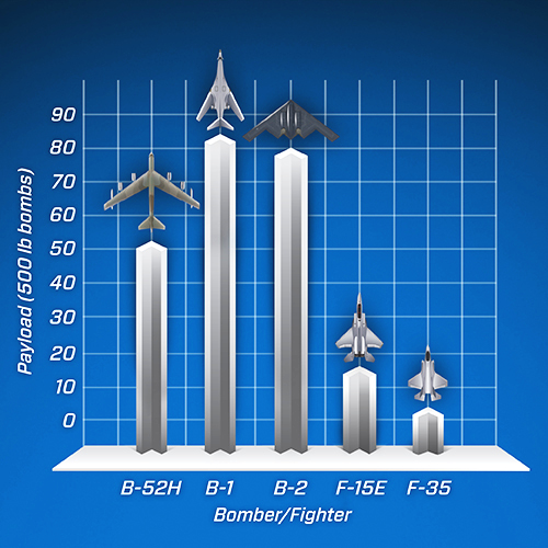 B-2A block30版通过旋转挂架可以在内置弹舱挂载16枚Mk 84“杰达姆”炸弹(或者16枚JSOW、JASSM 等导弹)。如果不使用旋转挂架,最多可以携带80枚500磅的Mk 82或者GBU-38 JDAM炸弹。而最新完成“1760内部武器舱”升级(IWBU)的B-52H,使用数字接口和旋转式发射架,内部武器舱也只是能携带20枚AGM-158B(JASSM-ER)巡航导弹,或者24枚500磅重的JDAM炸弹。要知道,B-52H的最大起飞重量超出B-2轰炸机70吨。当然,载油量上,B-2和B-52的差距就比较大了。而且B-2整体的载荷系数也不如B-52高,这主要是因为B-2考虑到隐身约束,机翼展弦比相对较小,不能外挂的缘故。